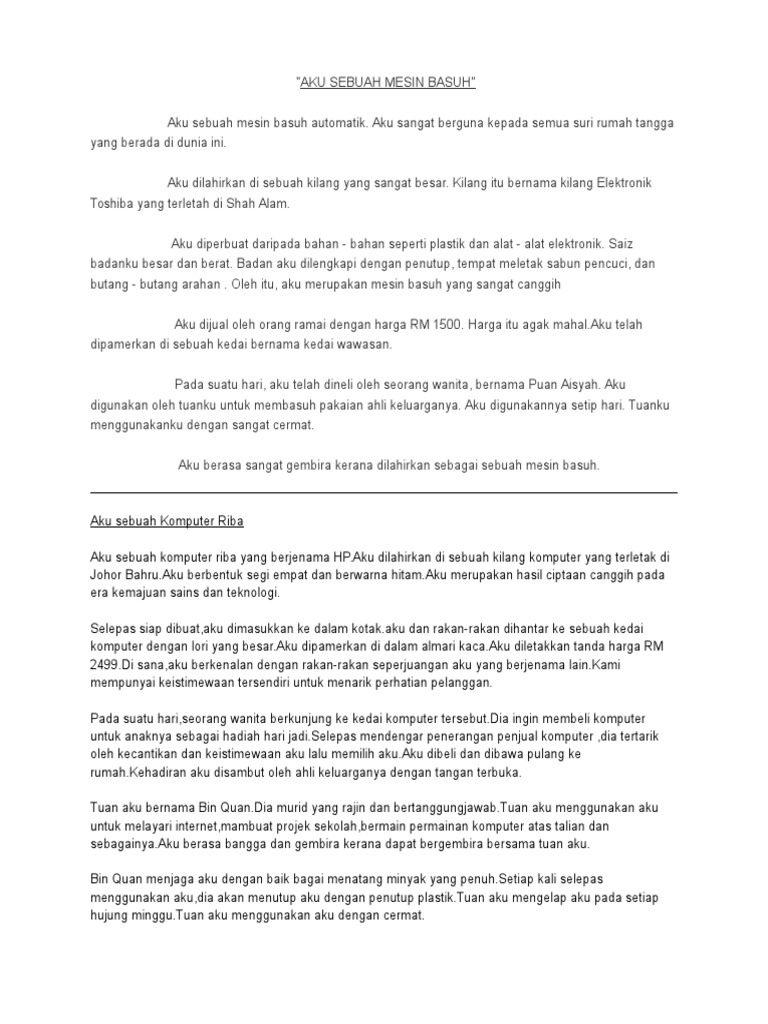 Pada suatu hari aku telah dihantar ke sebuah kedai basikal di Petaling JayaSelangor. Aku dilahirkan di sebuah kilang percetakan di Kuala Lumpur. Contoh Karangan Aku dilahirkan di sebuah kilang kain yang terletak di Temerloh Pahang.